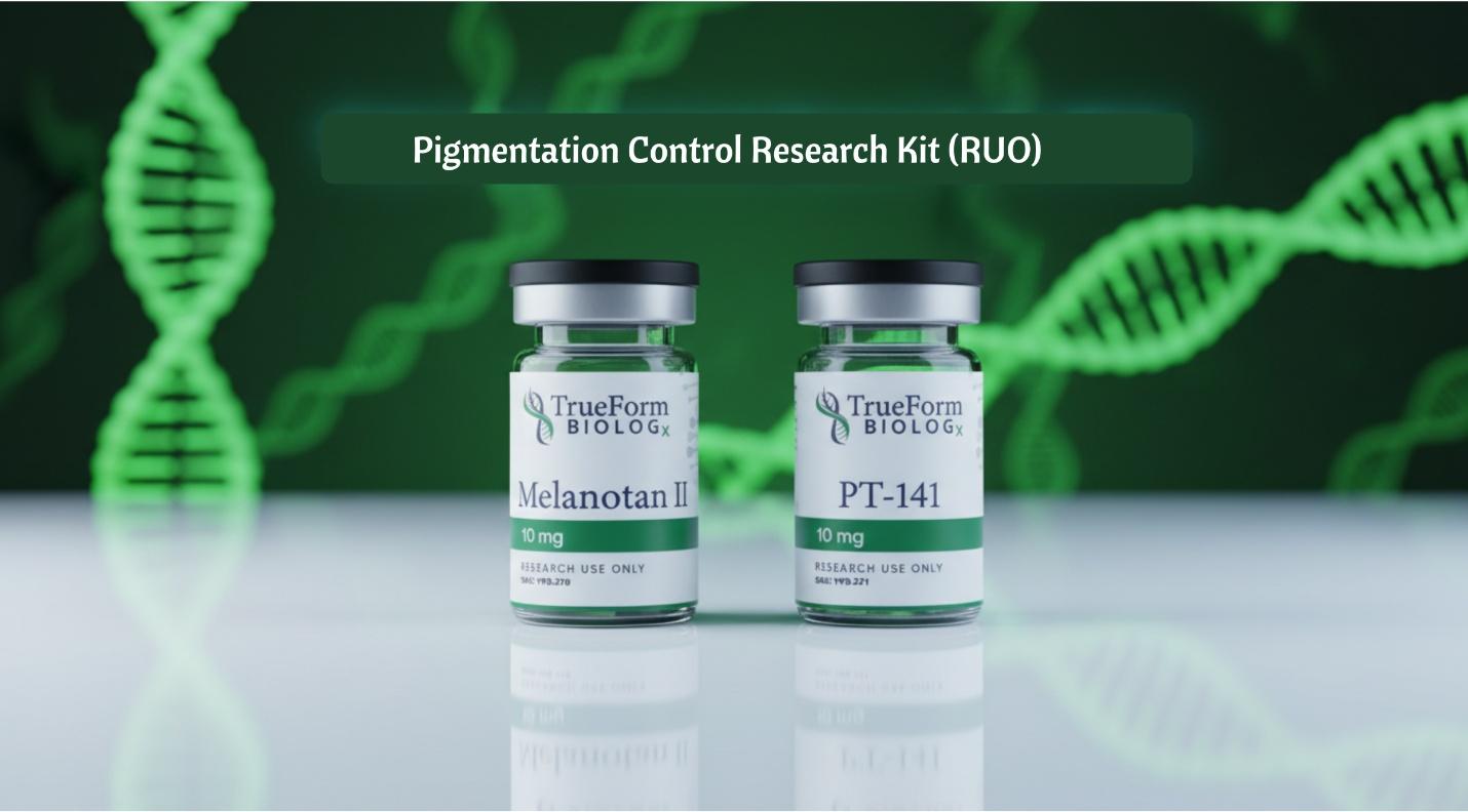 Pigmentation Control Research Kit RUO, PT-141 research peptide, Melanotan II peptide research, melanocortin pathway study, melanocyte regulation kit, TrueForm BioLOGx pigment research peptides, UV response research model, peptidergic pigmentation investigation.